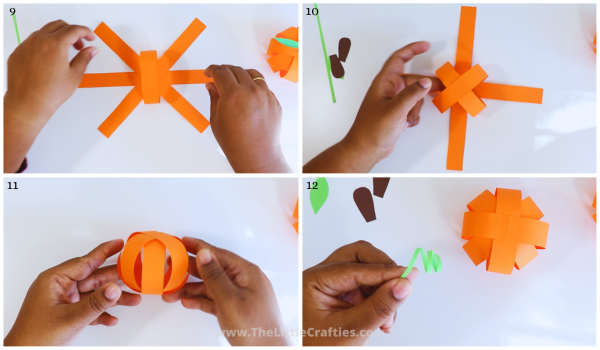 3. Tip: Gently manipulate the strips to give the pumpkin a slightly flattened or “squash” appearance for a more realistic look.